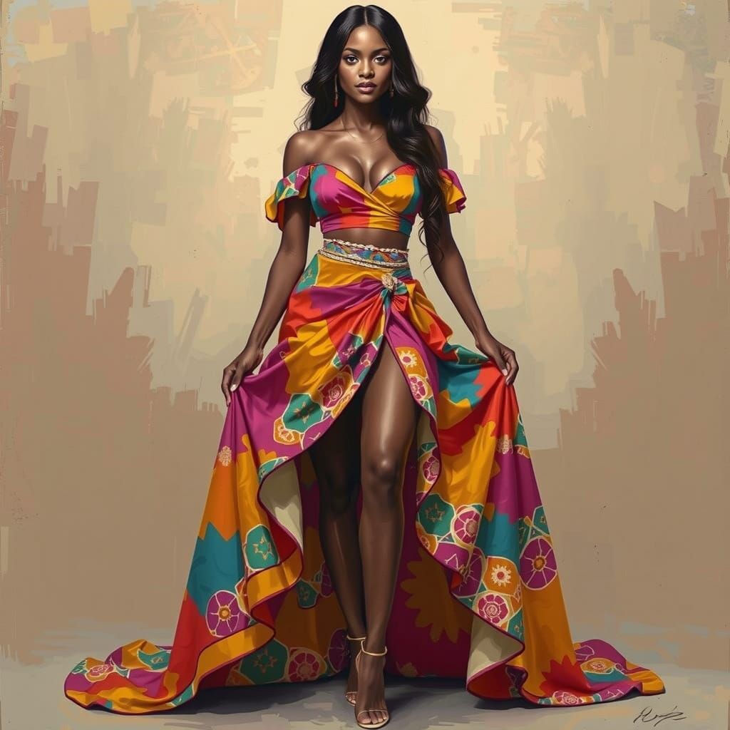 A striking picture of a beautiful Nigerian woman in a colorful dress. The hyperrealistic image showcases a luminous glow and warm lighting, reminiscent of classical portraiture.