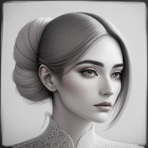 This image shows a monochromatic portrait of a woman with an unusual hairstyle. The close-up shot features delicate lines, soft textures, and a pastel background in an elegant ink illustration style.