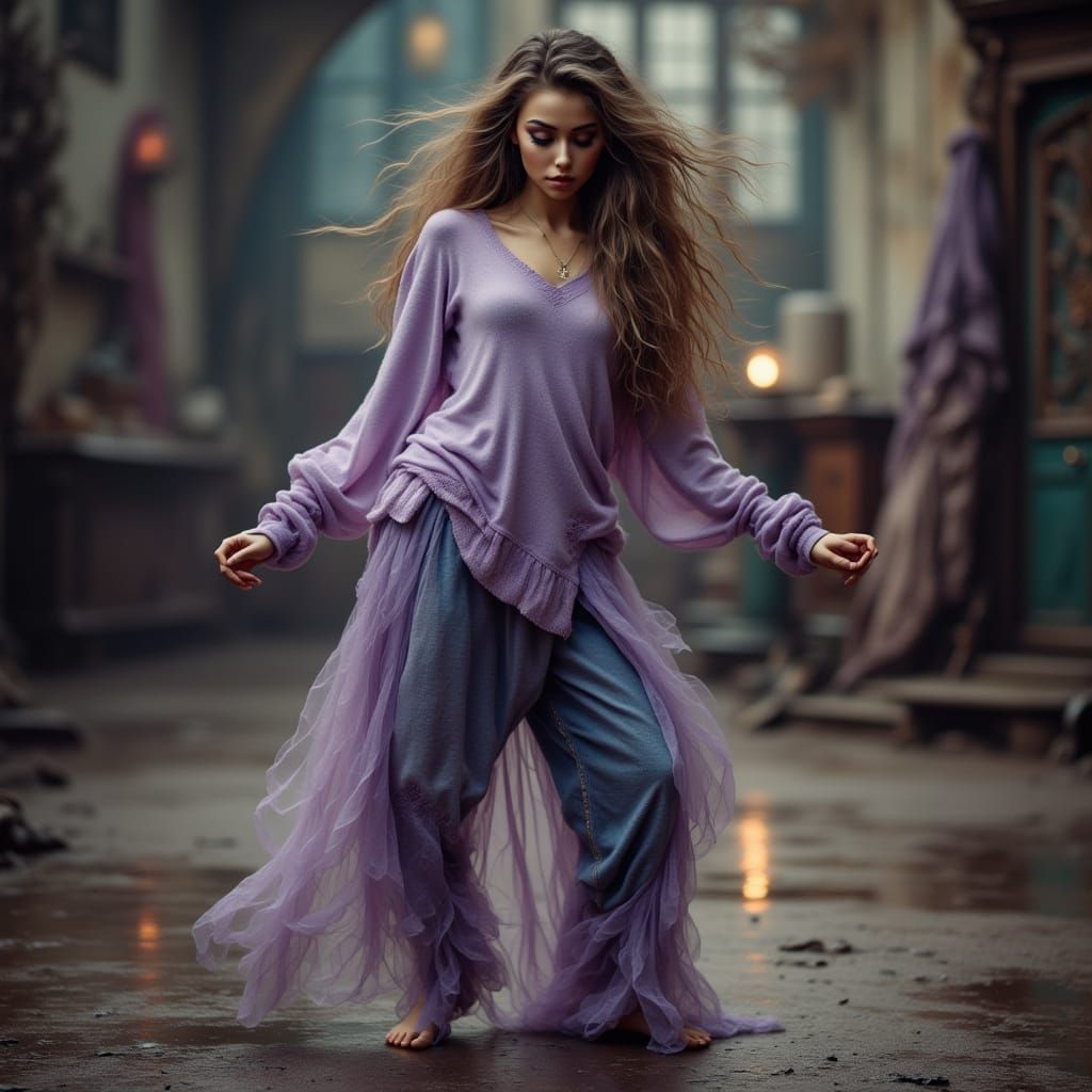 This hyperrealistic image shows a young female dancer in a light purple sweater and baggy jeans, mid-performance. Cinematic lighting enhances the moody atmosphere and sharp focus.