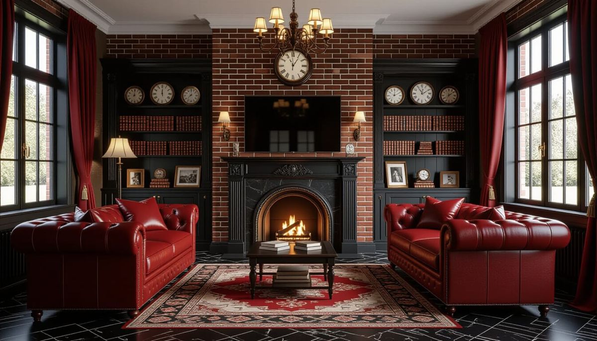 This image shows a dark Victorian living room featuring a red leather sofa, brick wallpaper, and a marble floor. Sunlight streams in, highlighting vintage decor and a central television, rendered in a detailed oil painting style with dramatic lighting.