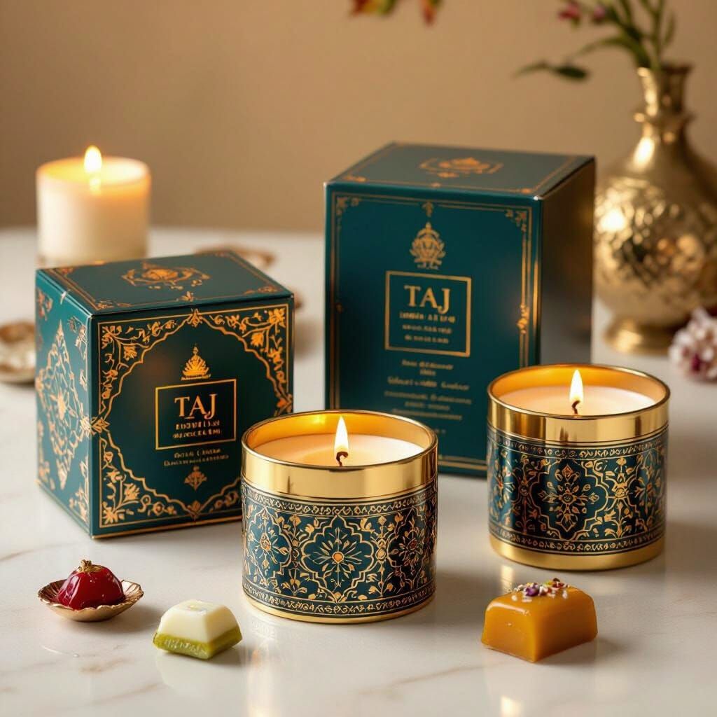 This image showcases premium Indian sweets and scented candles in opulent, gold packaging. Inspired by Indian Art Deco and Mughal miniatures, it features jewel tones and intricate patterns.
