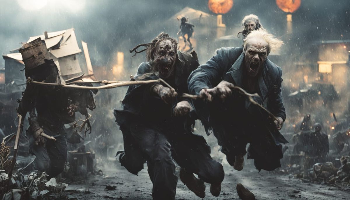 A dramatic dark fantasy scene of townspeople fleeing monstrous creatures across rooftops. The image features ominous shadows, dirty textures and a golden hour glow, as a digital painting.
