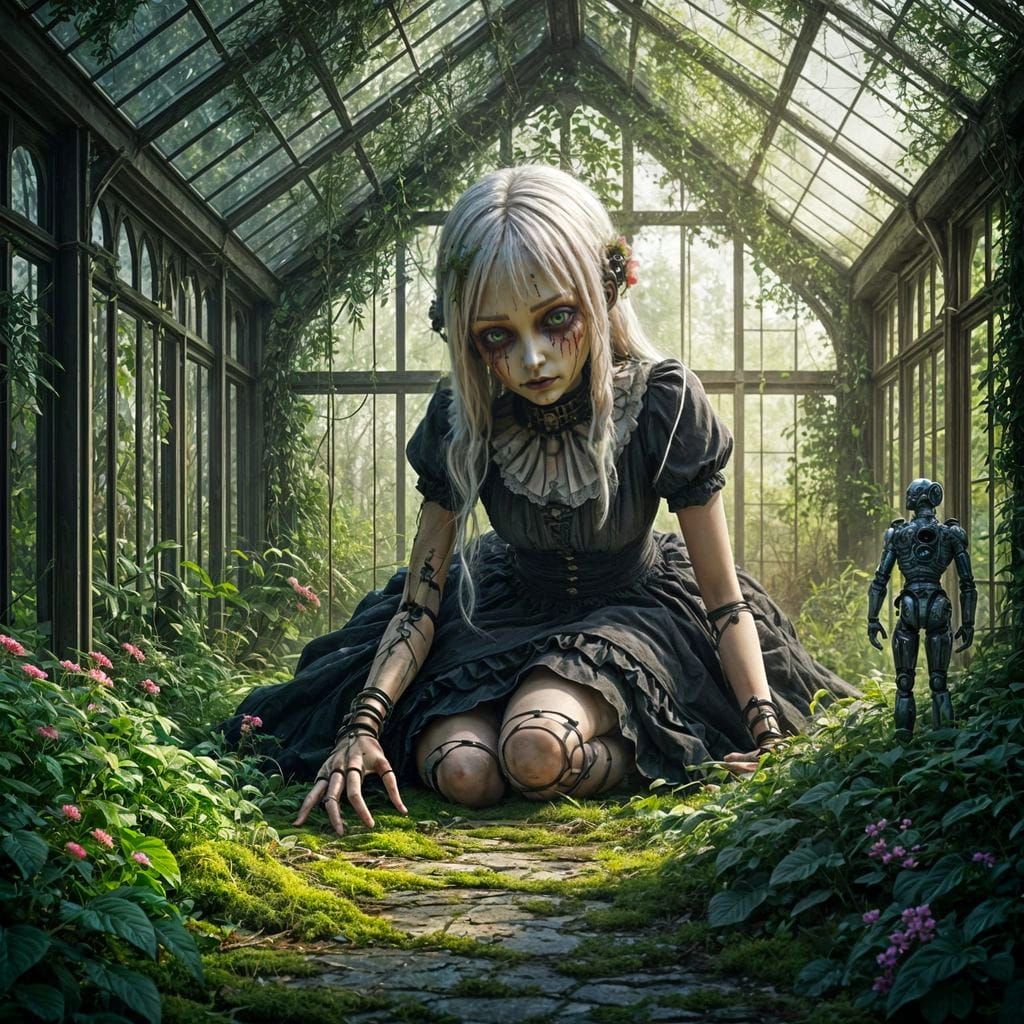 This image shows a giant marionette doll with white hair and a gothic dress in an overgrown greenhouse. A cyberpunk robot watches silently in this detailed, painterly, surreal scene.