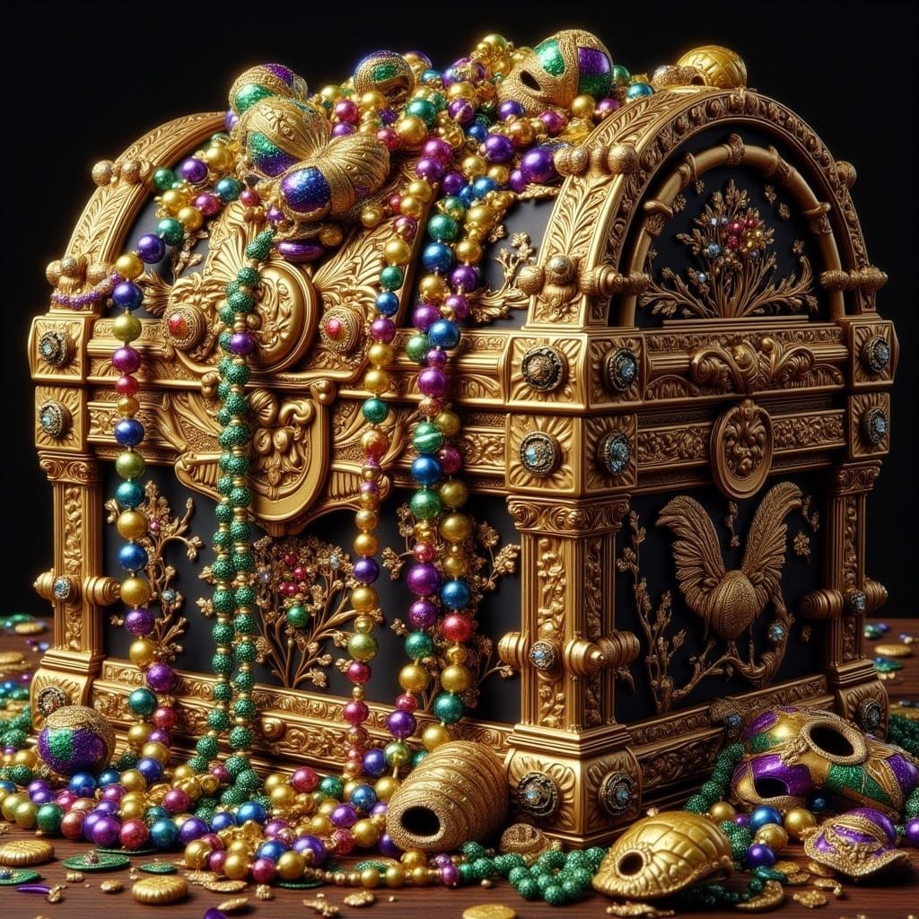This image shows a golden treasure chest overflowing with Mardi Gras beads and trinkets. The rendering style evokes woodcut printmaking and colorful, stylized pop art.