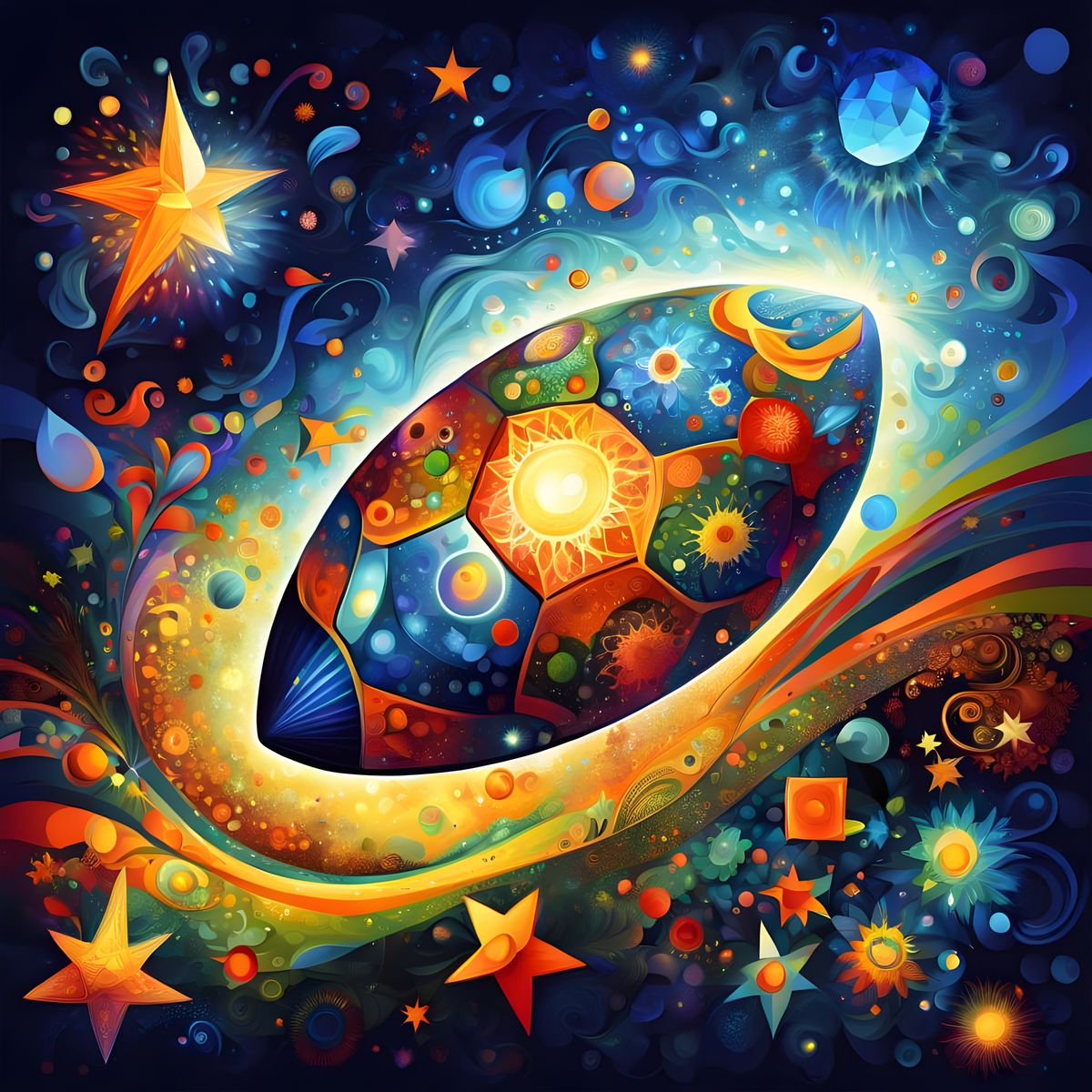 A macro close-up of a transparent, football-shaped starship speeding through a field of stars. The starship, rendered in an oil painting style, is filled with kaleidoscopic patterns in a cosmic setting.