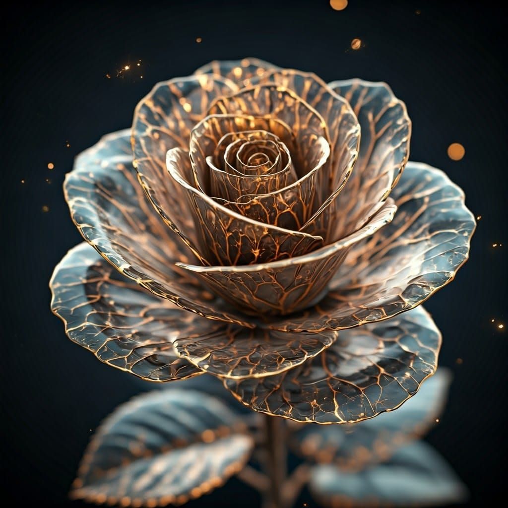 Abstract macro photography miniature glass rose. A 3D crystal, glass, diamond, perfectly transparent and see-through ava-flower in the light. Delicate, translucent Avaflower with intricate, glass-like petals and crystalline structure, refracting and reflecting light, surrounded by sparkling dewdrops, ...
