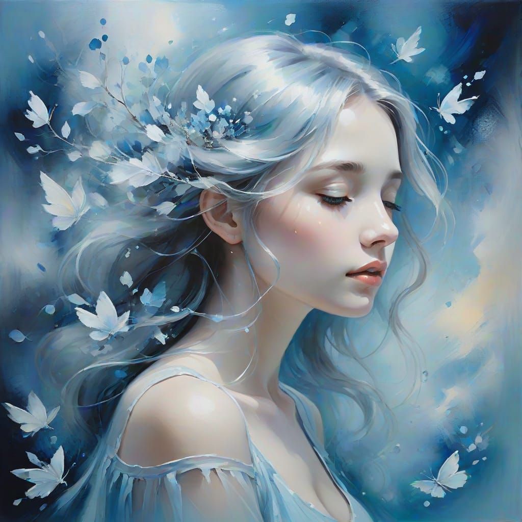 This image shows an ethereal figure in blue and silver tones, created in an impressionistic style. The translucent acrylics give the artwork a dreamy, fleeting quality.