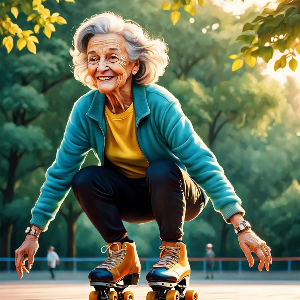 This image shows a smiling older woman on vintage roller skates at a rink. It is rendered in vibrant, warm colors and soft brushstrokes, reminiscent of an oil painting. The scene is bathed in golden hour light.