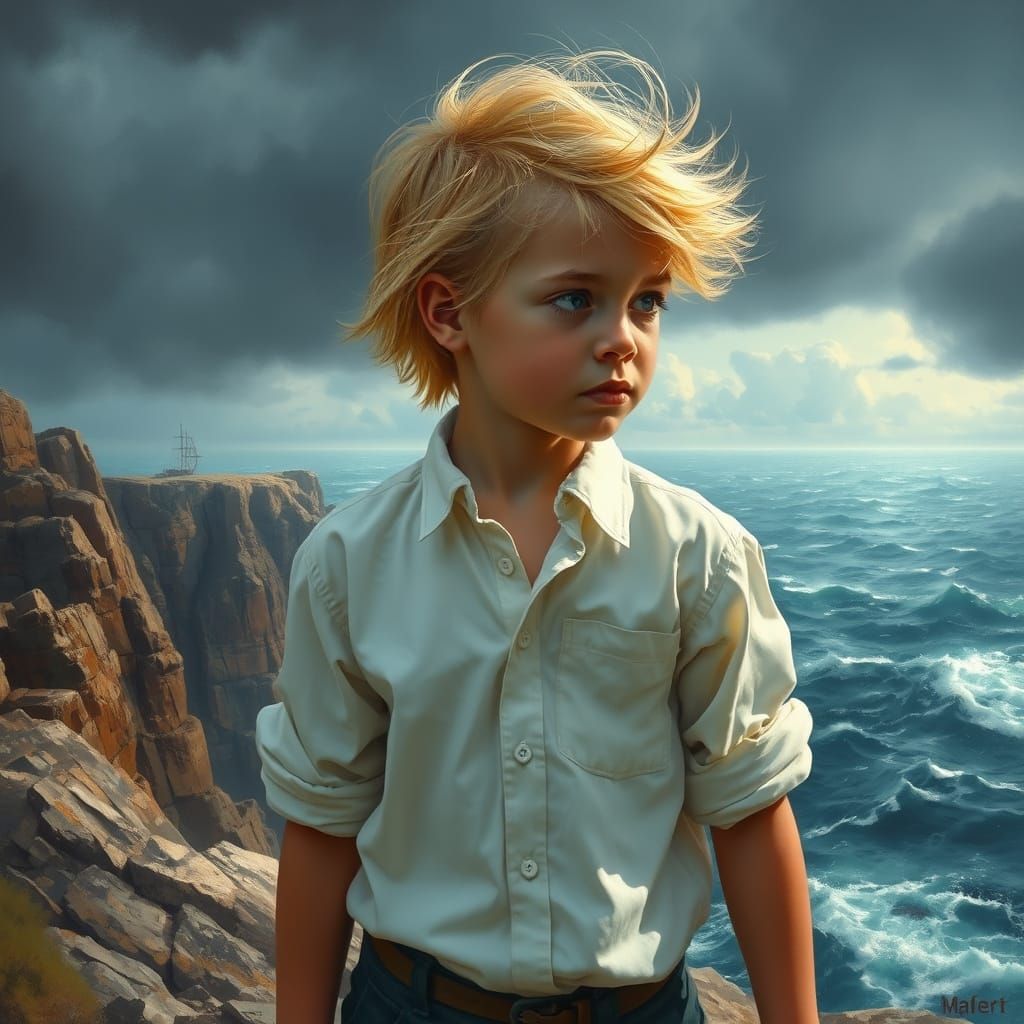A hyperrealistic oil painting of a blond boy standing on a cliff overlooking a stormy sea. The scene features dramatic lighting and vivid colors, with textures reminiscent of classic landscape art.