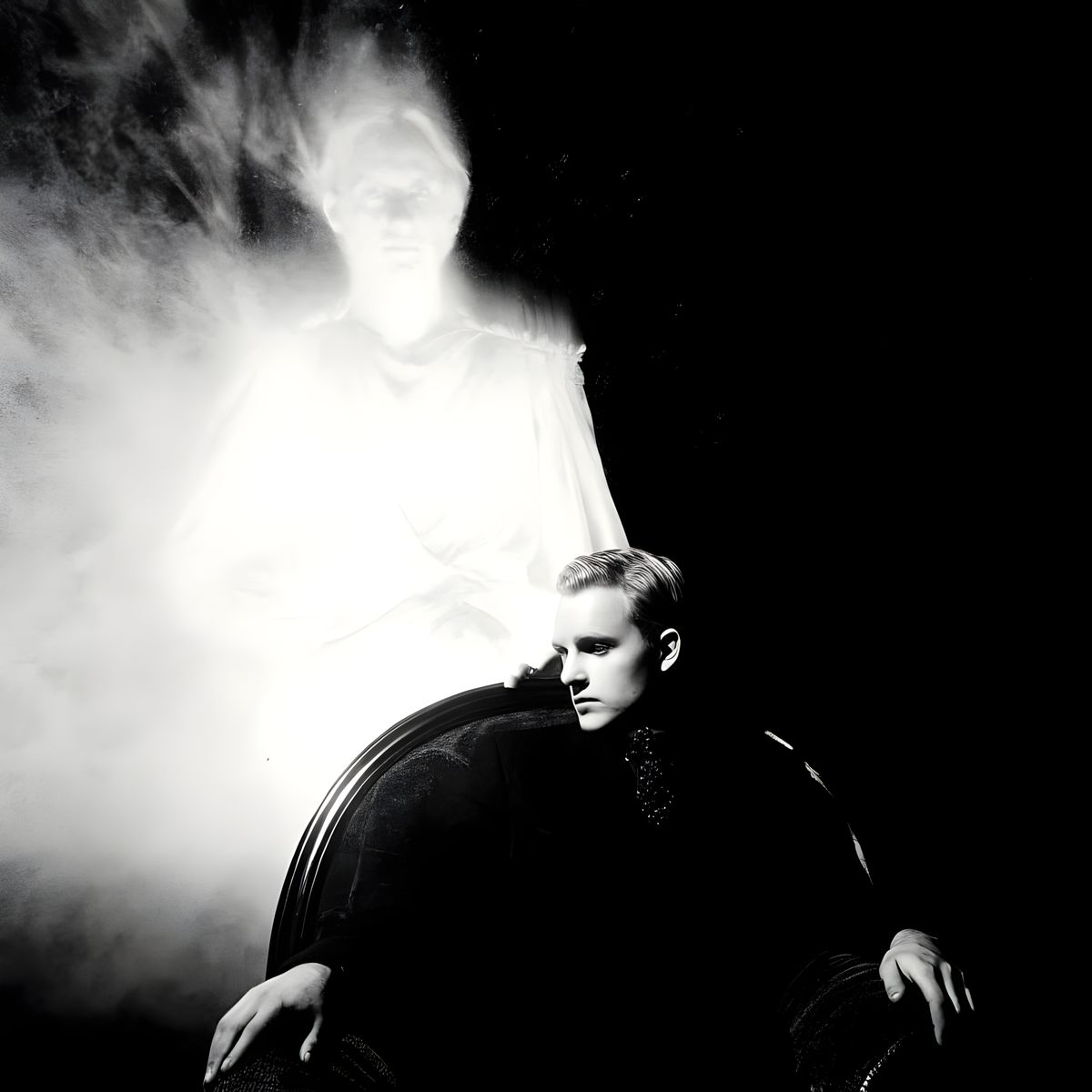 This classic portrait in the style of 1920s black and white photography features a man in a dark-toned suit, exuding a sense of melancholy. A ghost-like figure overlaps his form, adding an air of mystery. Rendered in a heavily textured, aged sepia tone, the image captures the stillness and emotion of the...