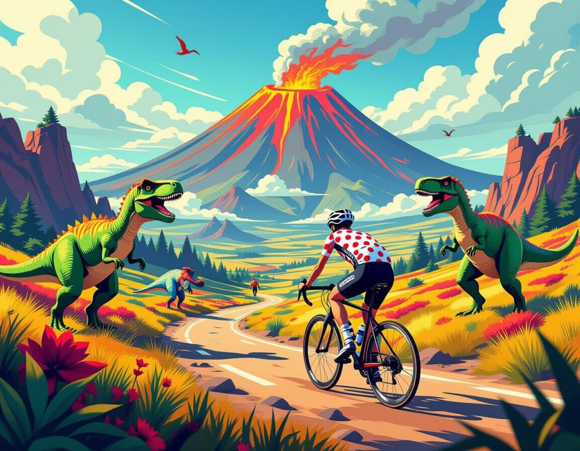 A vibrant digital artwork featuring a lone cyclist in a polka dot jersey racing through a Jurassic landscape. Dinosaurs in colorful costumes cheer on the roadside.