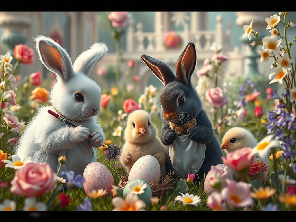 This image shows adorable bunnies and a chick painting Easter eggs in a colorful meadow. The artwork features hyperrealistic textures, intense colors, and a blend of vintage and cinematic elements.