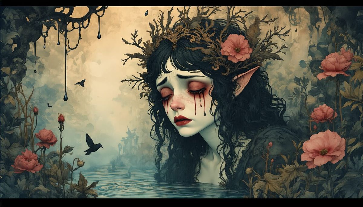 A hyper-detailed, photorealistic image capturing a maximalist retro-futuristic scene. Rendered in rich ink and watercolor, it features a surreal figure with soulful features, evoking a sense of melancholic beauty.