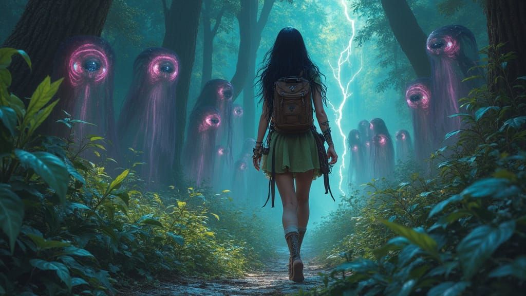 This image shows a black-haired elvish scout navigating a maze. Shimmering apparitions surround them amidst crackling magic, in a hyperdetailed earth art style with vibrant colors.