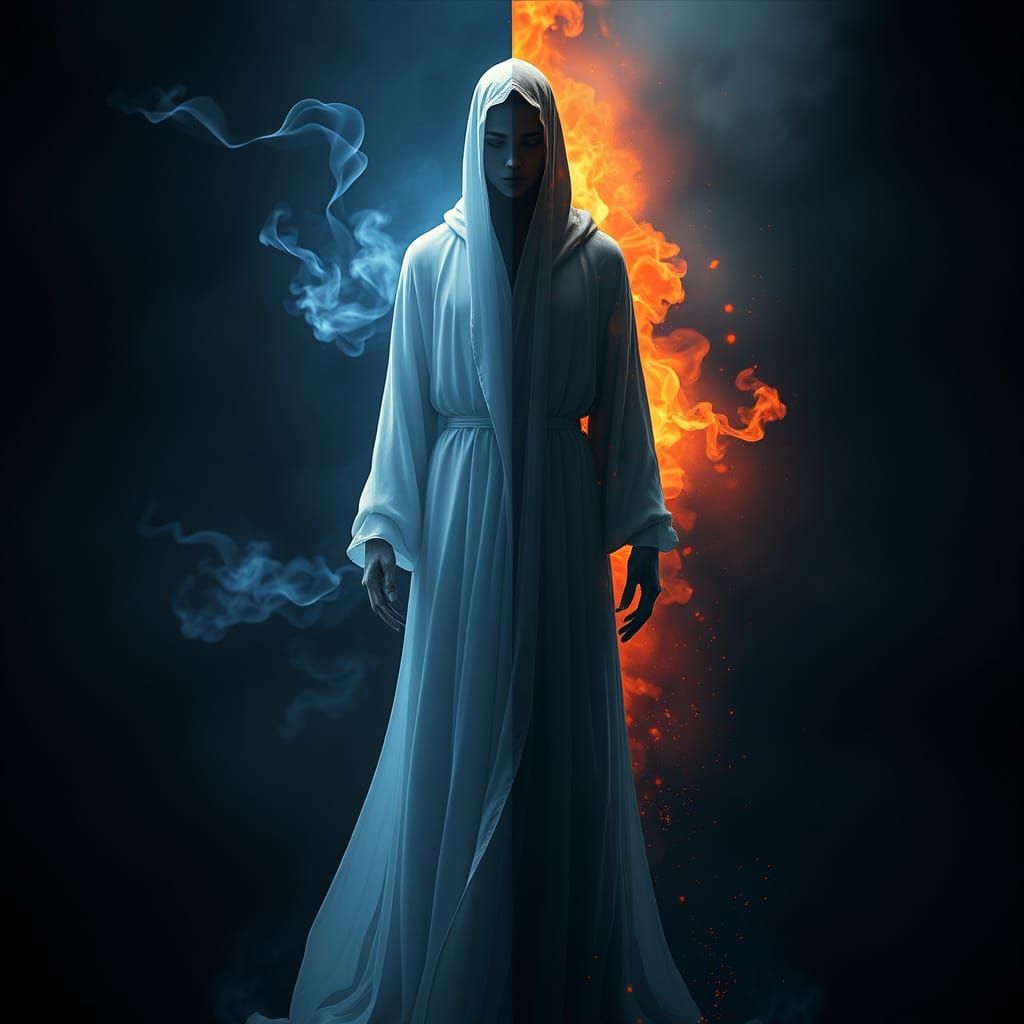 This image shows a cloaked figure split between serene blue light and intense fiery darkness. A hazy threshold with swirling particles blurs the stark contrast, creating an atmosphere of mystery and unraveling reality.