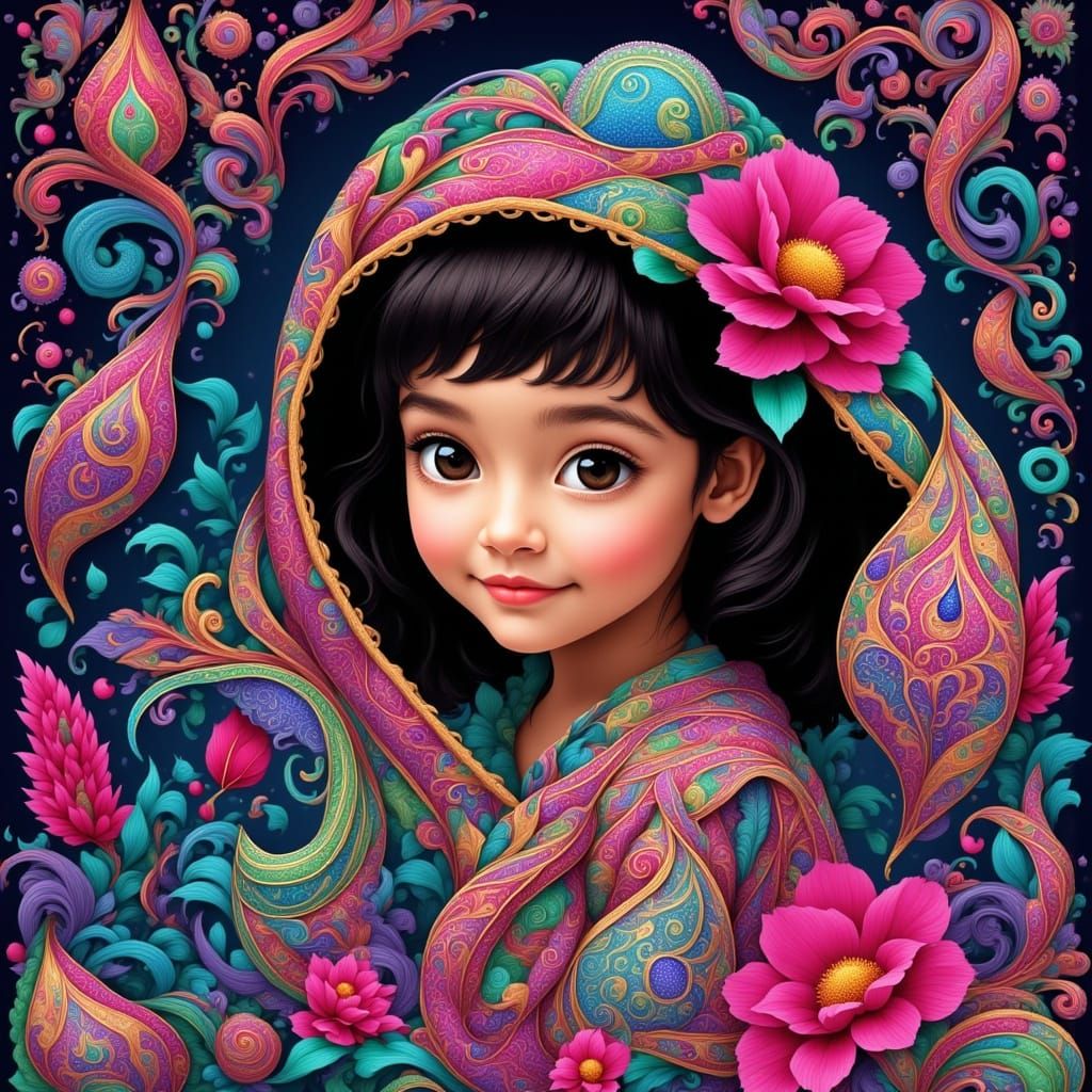 This image shows a young girl surrounded by intricate paisley patterns in bright, neon colors, set against a dark background with a glossy finish, creating a striking digital art piece reminiscent of modern aesthetic styles.