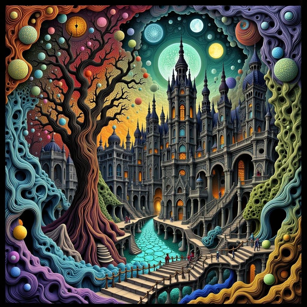 This image showcases a detailed matte painting with deep, complementary colors. It features fantastical elements and intricate details, presented as high-resolution concept art.