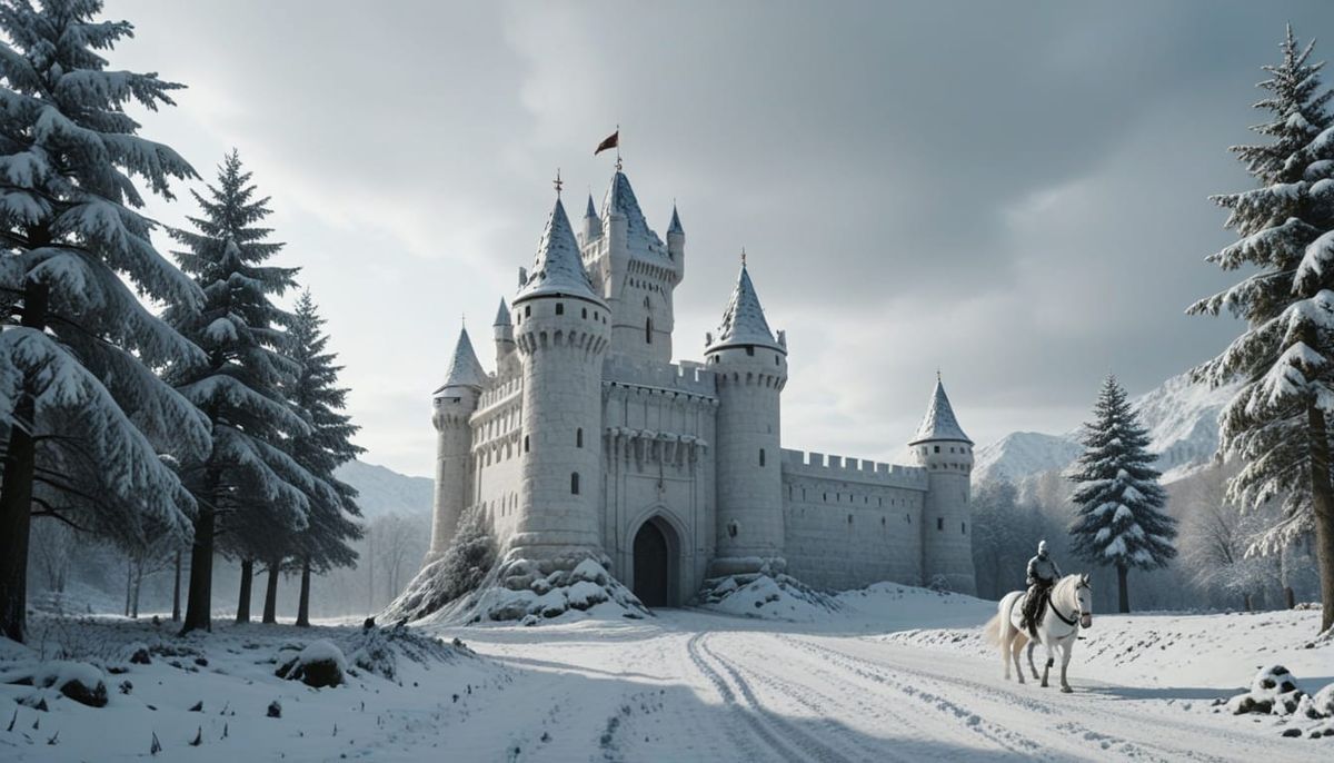 This image captures a cinematic, wide shot of a white marble medieval castle blanketed in snow. A knight in white armor on a white horse approaches the castle entrance.