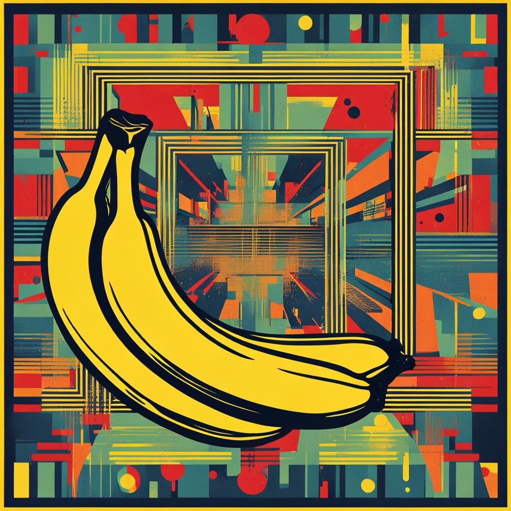 A vivid pop art screen print of a banana. The digital artwork employs triadic colors, a golden ratio composition, symmetry, and the rule of thirds, in a geometric Bauhaus style.
