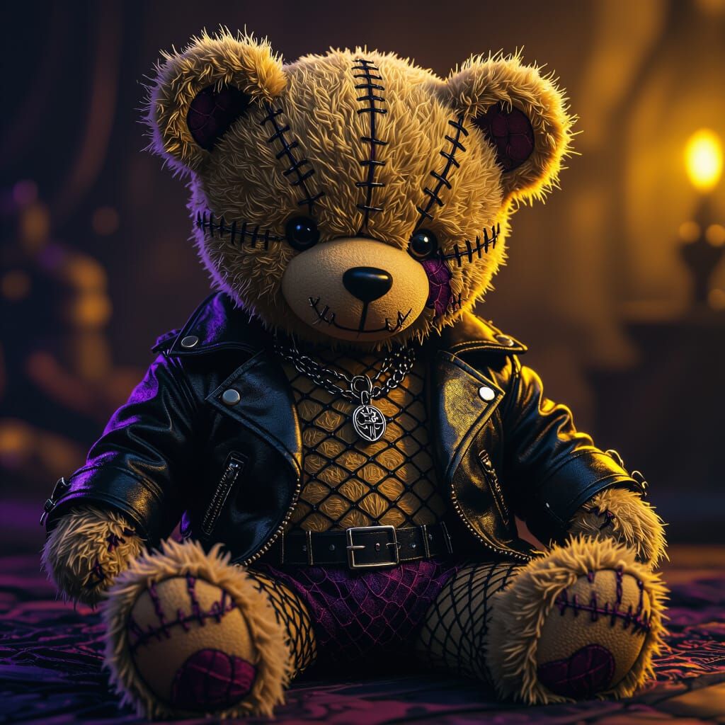 This image shows a goth teddy bear in a dark fantasy world, dressed in leather and fishnets. It features dynamic lighting and detailed textures with purple and yellow accents.