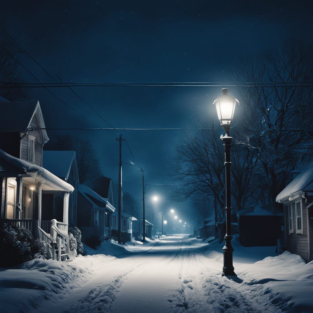 This striking image captures a snowy suburban street at night, bathed in the ethereal glow of a solitary streetlamp. Houses appear as dark silhouettes under a moody blue and white sky, with warm light accents.