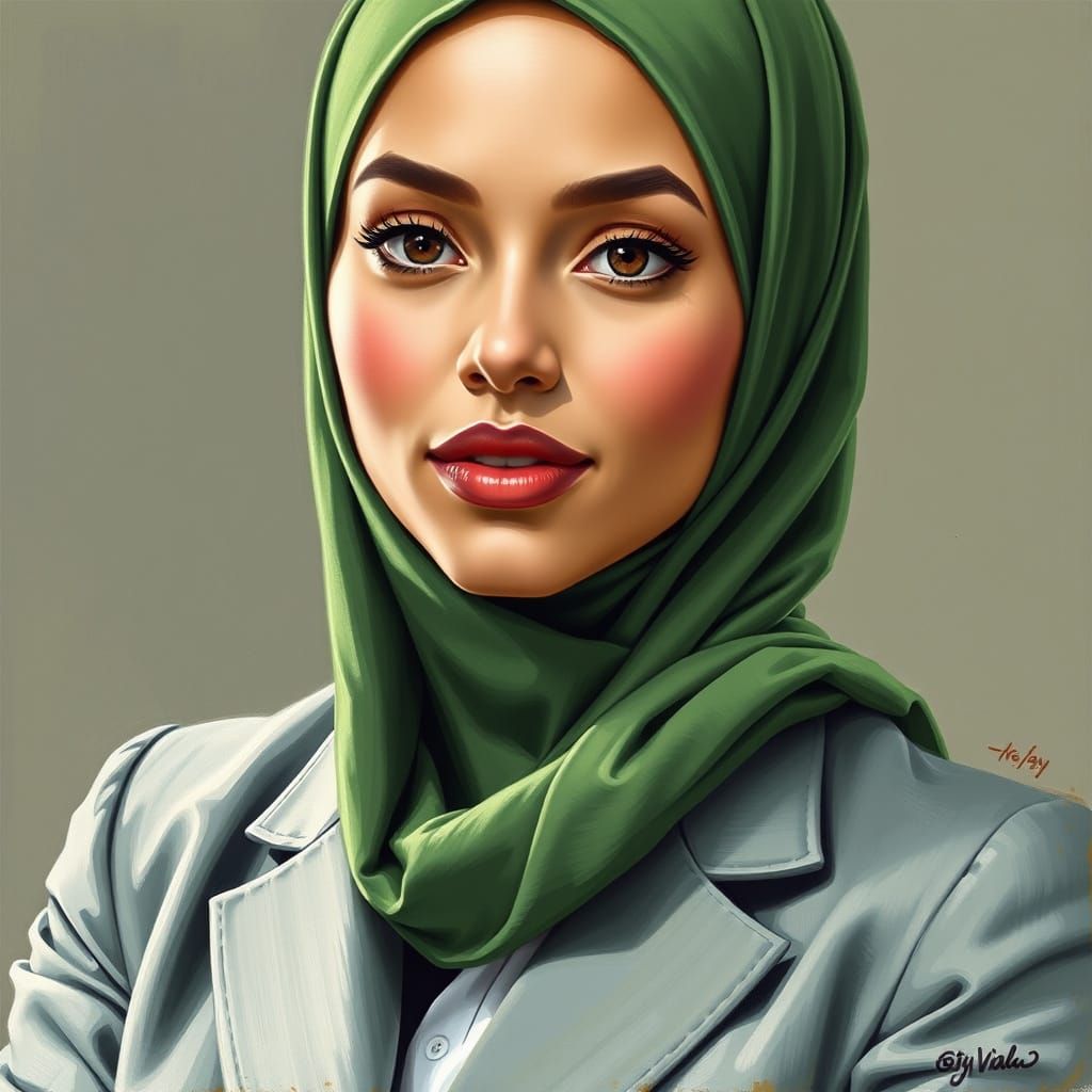 This image shows a head and shoulders portrait of a confident, fair-skinned businesswoman wearing a green hijab and a loose-fitting business suit. The artwork is highly detailed.