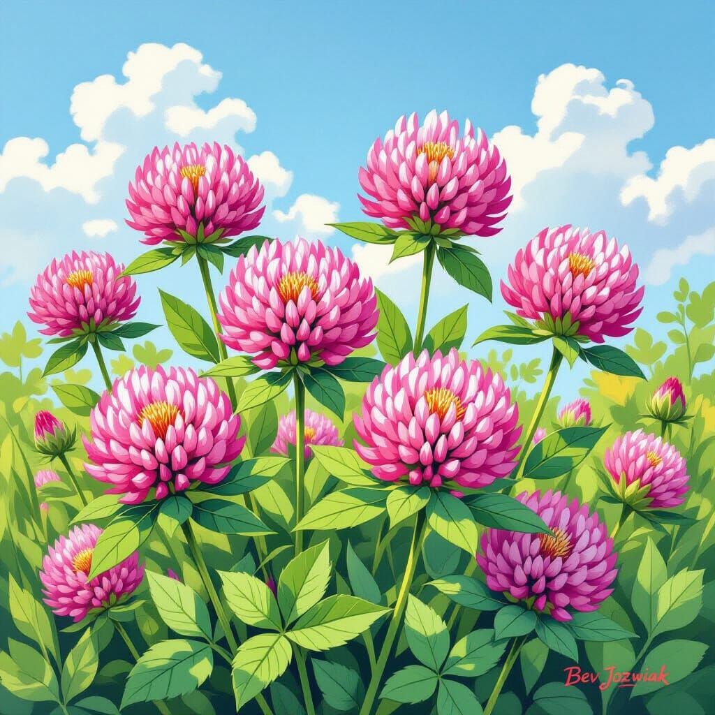 A vibrant image of pink red clover flowers blooming in a garden against a bright blue sky with white clouds. The watercolor painting uses bold brushstrokes and vivid colors.
