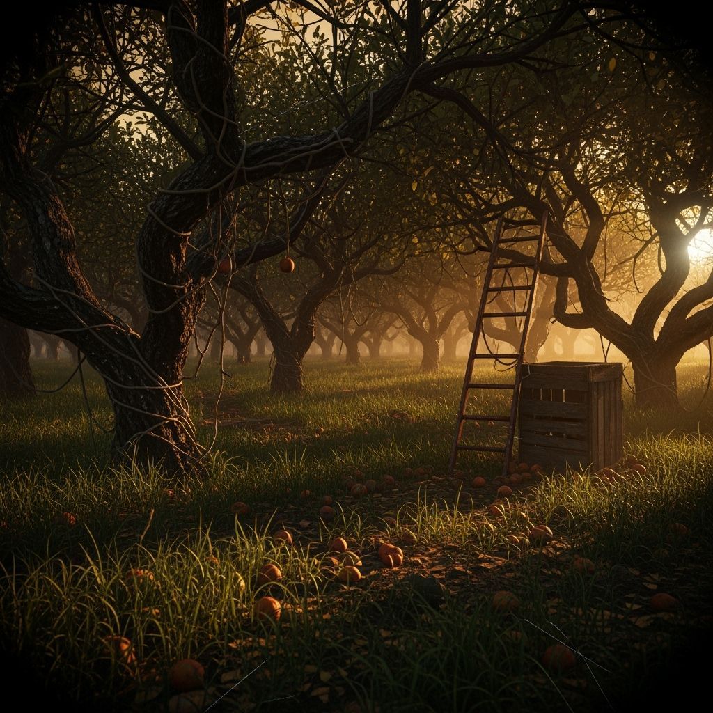 This image shows an overgrown, abandoned orchard in amber twilight. Twisted trees, tangled vines, and fallen fruit are depicted with dramatic shadows, desaturated colors and film grain, in a vintage cinematic style.