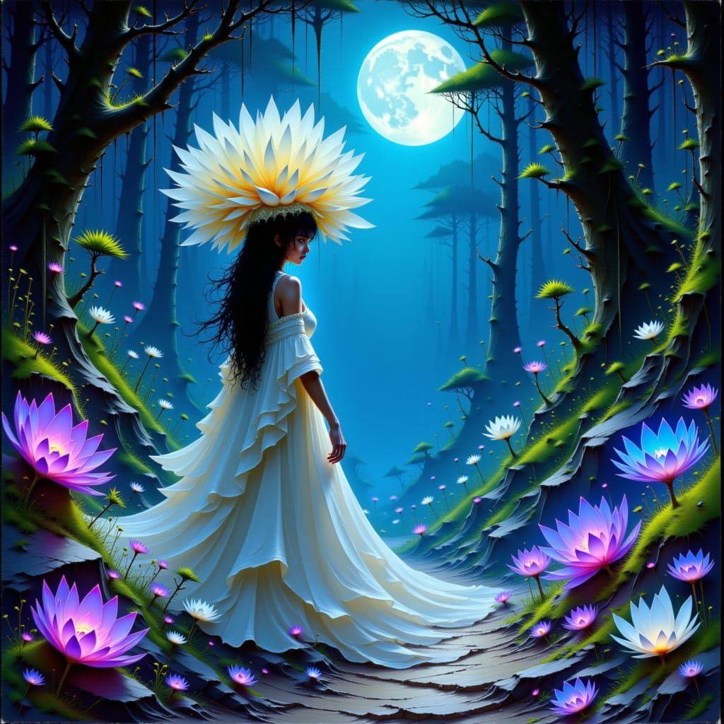 This image shows a woman in white robes standing in a moonlit forest. Bioluminescent vines and opalized ammonites add to the fantasy art style, set against a backdrop of deep blues and purples.
