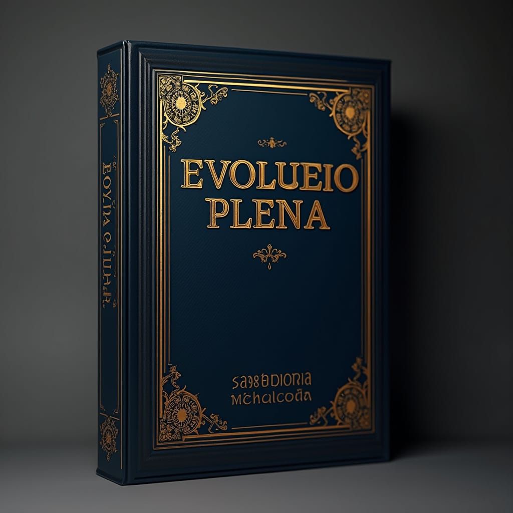 This image features a luxurious black lacquer box with intricate gold lines, evoking sophistication and elegance. The title 'EvoluΓ§Γ£o Plena' is embossed in deep blue, Playfair Display font, with a raised effect, adding depth and richness. The silver text 'Sabedoria Espiritual' in Montserrat font, also ra...