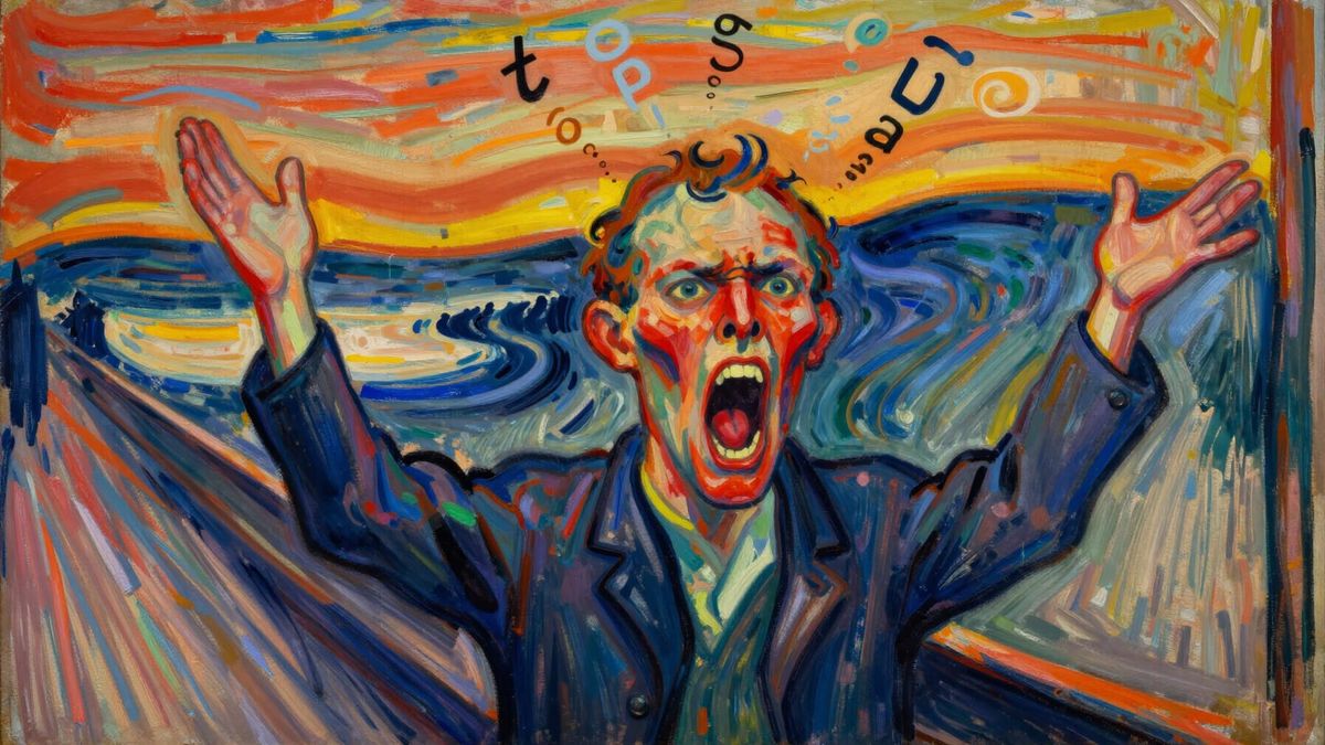This image shows a caricature of an enraged, red-faced man with a bobble head, shouting amidst a storm of colorful curse word symbols. Rendered in a dynamic expressionist style with bold strokes and vivid colors.