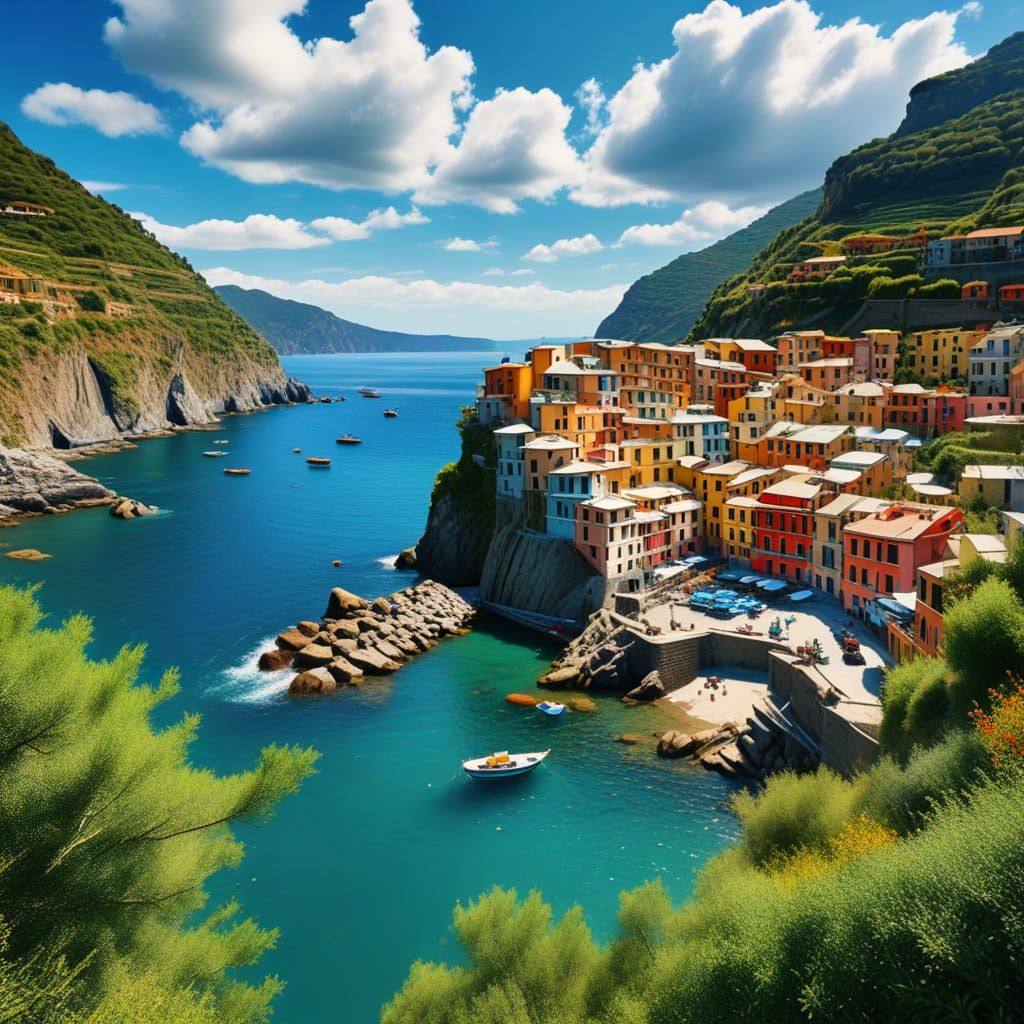 This image showcases a picturesque Italian coastal village with colorful houses and boats docked in a turquoise bay, rendered in a lively oil painting style with rich textures and dynamic lighting.