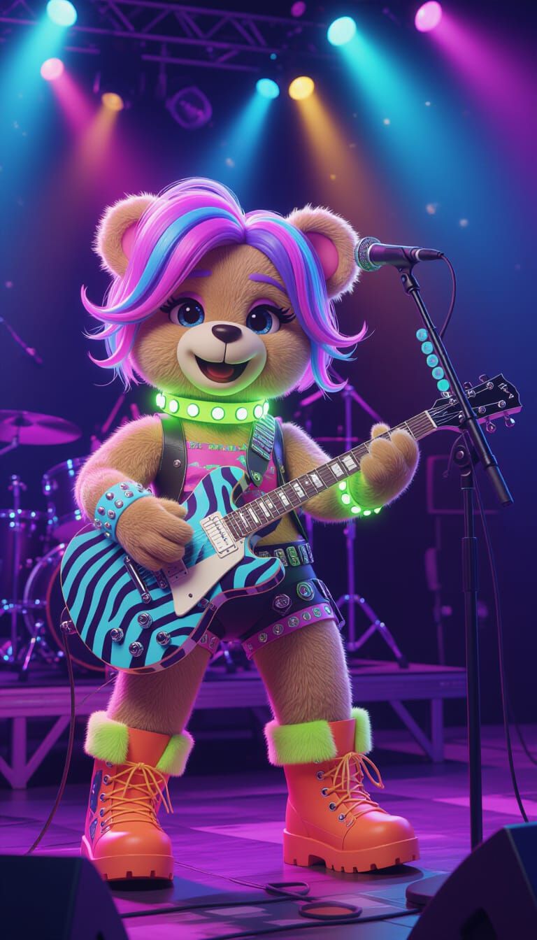 A hyper-detailed 3D illustration of a teddy bear rockstar with purple and rainbow hair, performing on a concert stage with glowing lights and a cheering crowd.