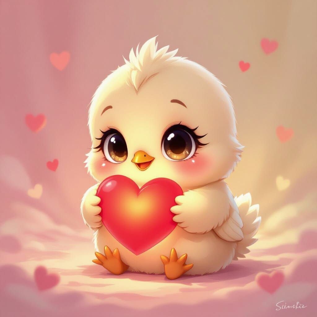 This image features a charming kawaii baby chick holding a radiant red heart. Rendered in a soft, pastel anime style with a gentle gradient background, it evokes warmth and affection.
