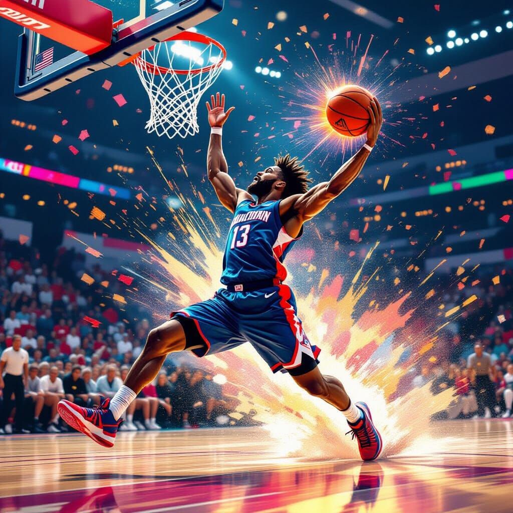 A dynamic image of a basketball player performing a slam dunk. The artwork features vibrant colors and textures in a dramatic, cinematic style with film grain and vignette effects.