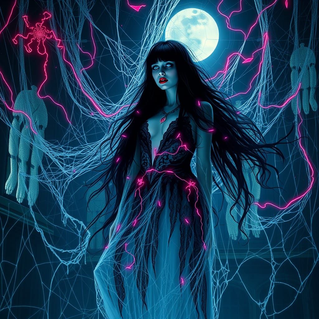 A haunting gothic goddess with glowing skin and electric eyes drifts through a decaying Victorian mansion, adorned with intricate cobwebs and neon lights. Surreal, detailed, and macabre.