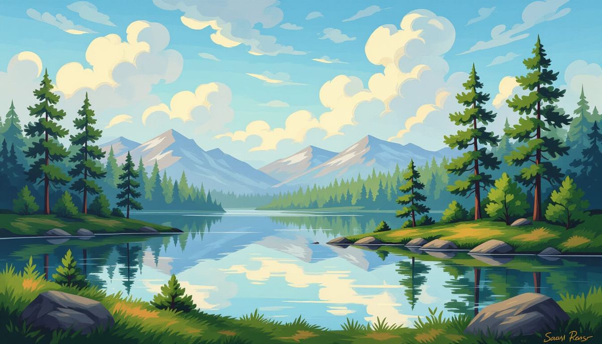A serene landscape featuring happy little trees, a sparkling sky, and a peaceful lake surrounded by a lush forest. This artwork evokes the style of Bob Ross, enhanced with fine details and a blend of colors.