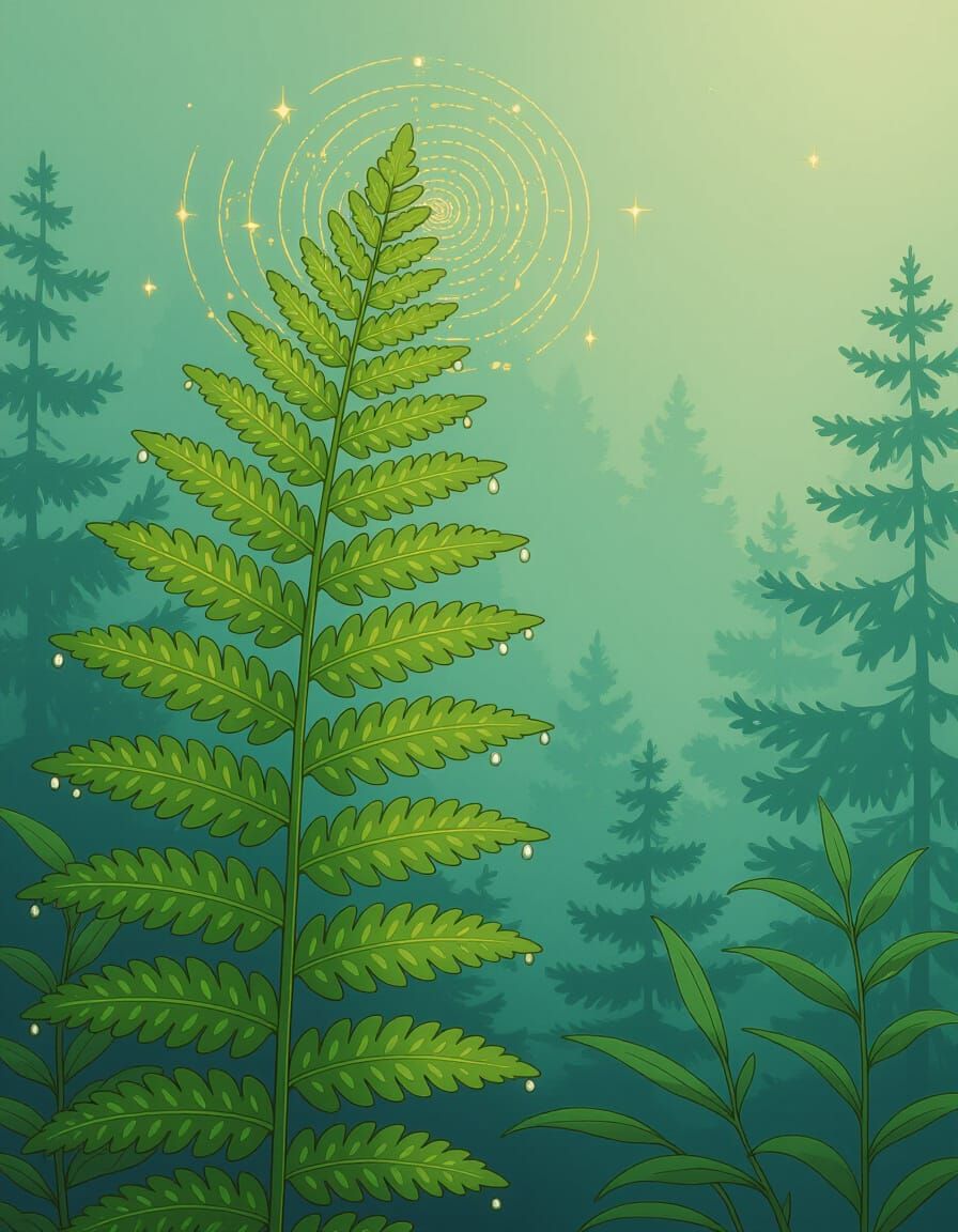 This image shows a single fern with detailed fronds adorned with glowing geometric patterns. The vintage anime style illustration is reminiscent of classic animation, with dew drops reflecting soft light.
