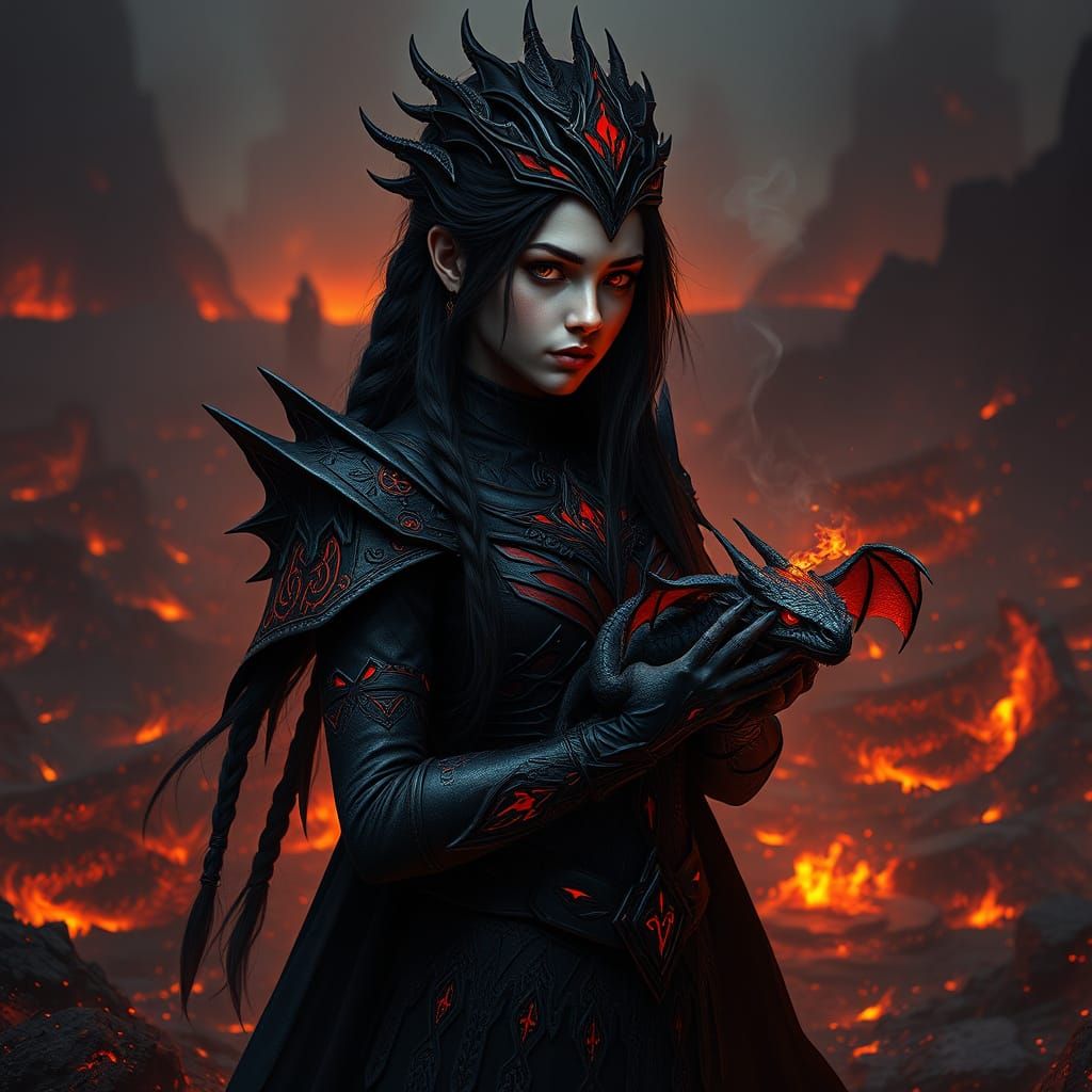 A hyper-detailed fantasy image of a young sorceress in blackened armor holding a demonic dragon hatchling amidst a volcanic wasteland. The scene is lit with ominous shadows and glowing embers, in a dark gothic aesthetic.