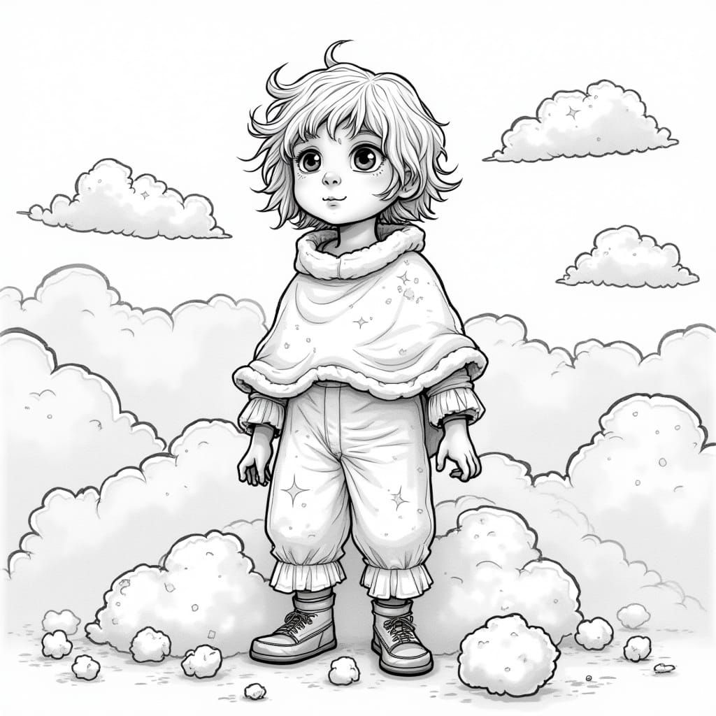 This image is a charming illustration of a foster child wrapped in toilet paper shawls, surrounded by puffy cotton ball clouds, rendered in a detailed black and white coloring book style with intricate textures and lines, reminiscent of fantastical worlds and deep matte painting.