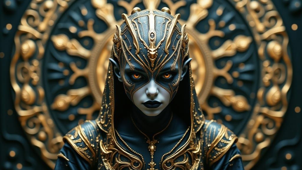 This hyperrealistic digital painting showcases an alien's head and shoulders, featuring a detailed, majestic mandala in the background. The artwork uses dynamic lighting for an intense, otherworldly atmosphere.