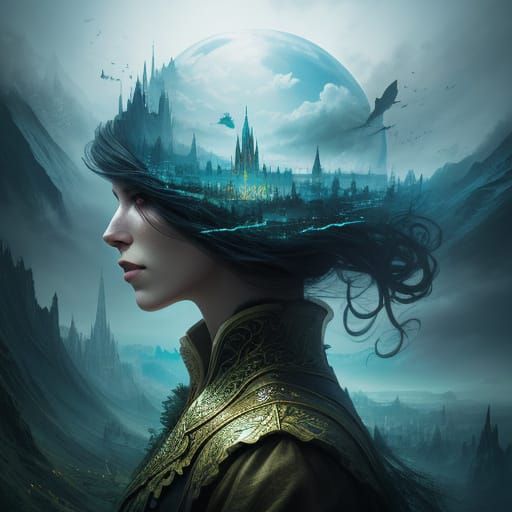 This image is a surreal blend of a stunning fantasy landscape and a beautiful portrait, created through a double exposure technique.