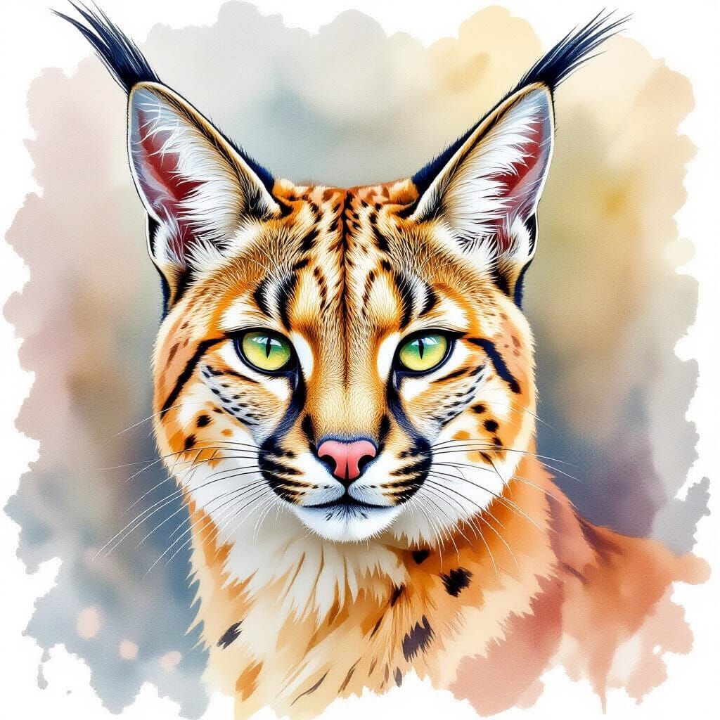 This image captures a lifelike caracal rendered in a realistic watercolor style, showcasing the feline's distinctive features with delicate brushstrokes.