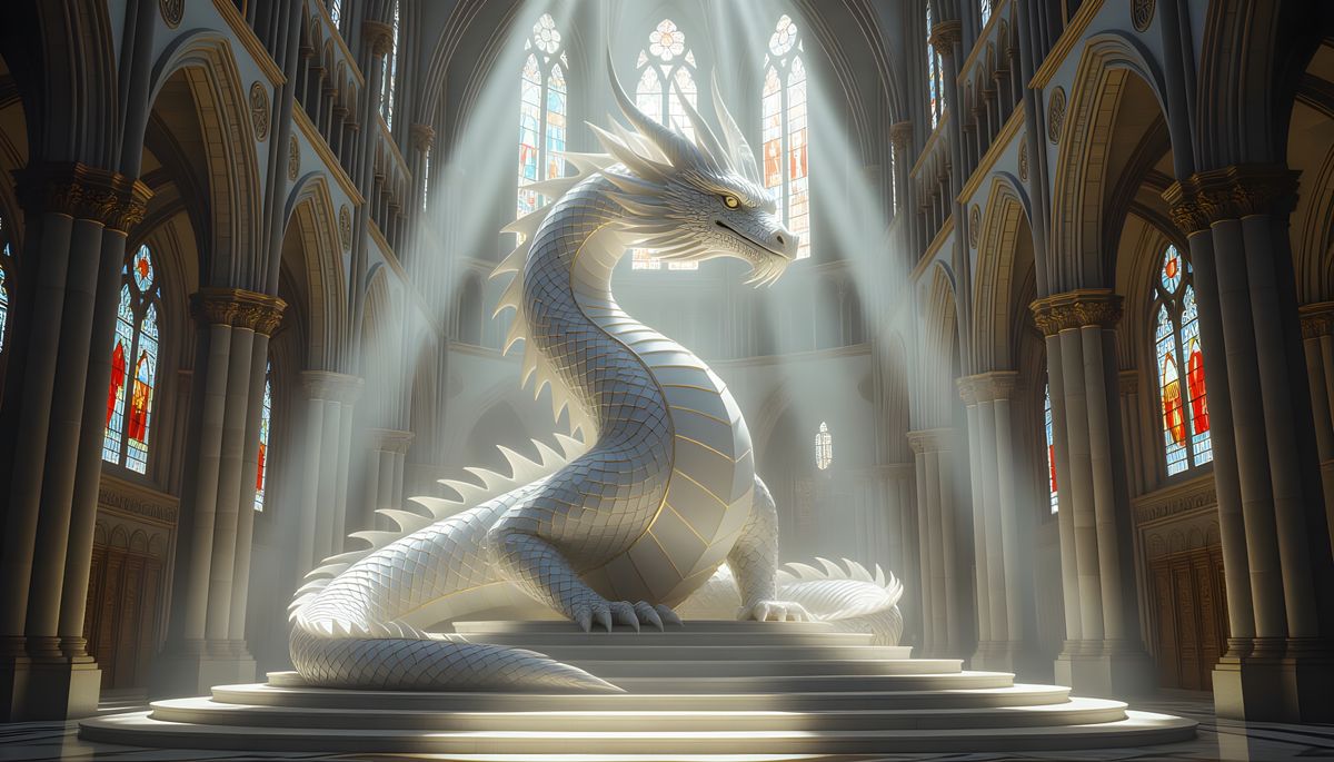 This image shows a dragon carved from white and gold marble, standing on cathedral stairs. Nordic knotwork is etched into its body, with dramatic shadows and shattered stained glass creating a moody, cinematic atmosphere.