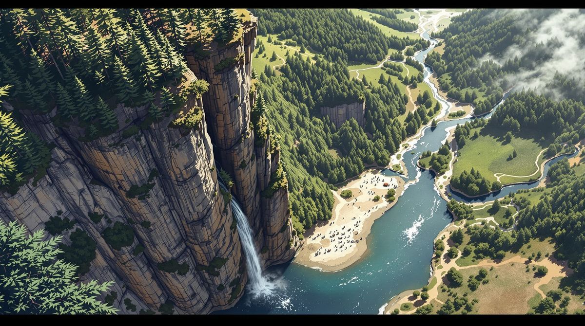 50โs 4 colour raster print cartoon: The shot snaps tight on a towering sauropod - Sauroposeidon- wind tearing past as she looms on a conifer-crowned escarpment. The camera rockets along her neck to the cliffโs edge, then commits to a pure vertical climb: straight up, fast. We rise past her head, then ...