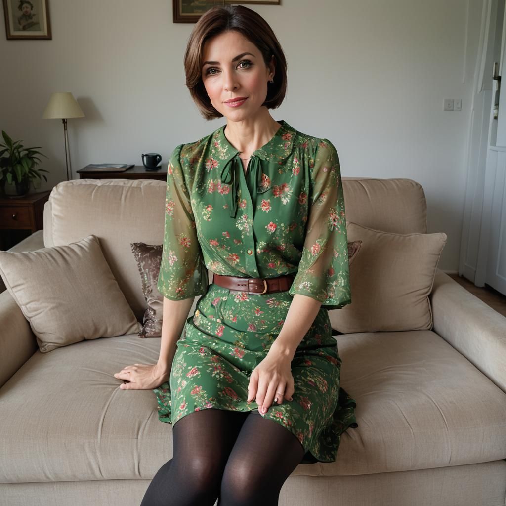 view of European [woman] in living room, white skin [[[looks a bit like elissa abdouli]]], brown straight short hair , beautiful big green eyes, big , slim, thinner, shorter height, slightly light thin ( ((blouse))) with short sleeves, (((skirt))) with floral pattern, (((sheer tights))) ...