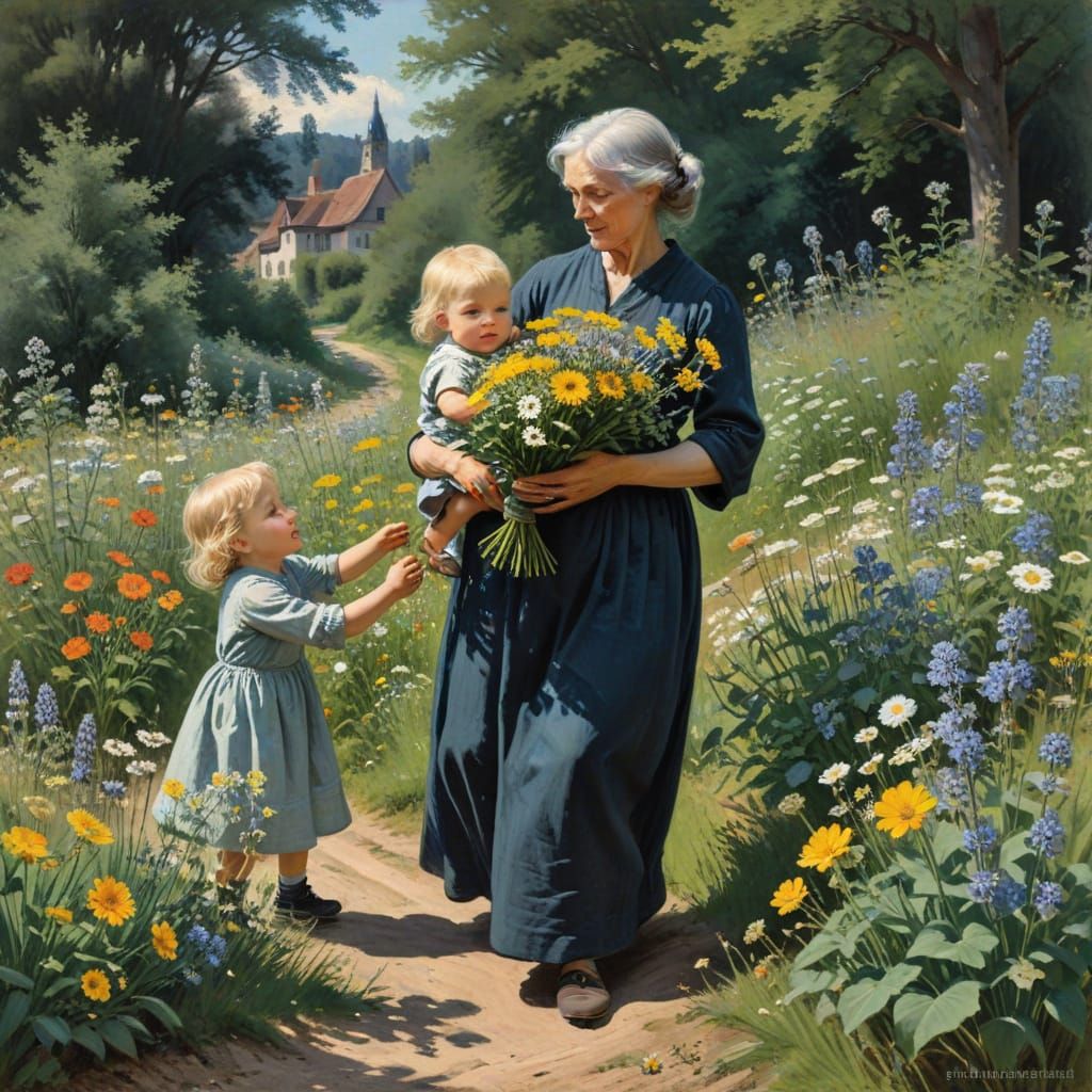 A heartwarming scene of a young child presenting a bouquet to their grandmother amidst a colorful garden of wildflowers, reminiscent of the works of German Expressionist artists.