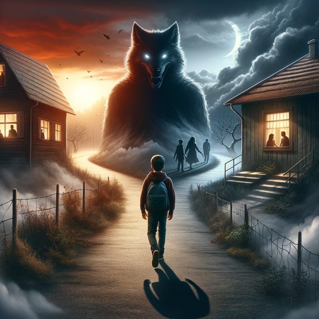 This image shows a boy walking toward his future, represented by an adult shadow. A school and old house flank his path as a wolf watches. The scene is a matte painting with high contrast and deep color saturation.