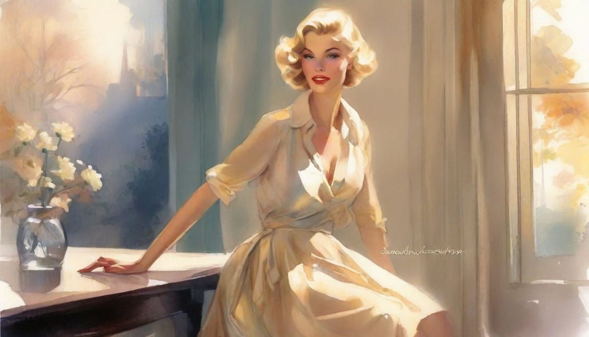 This elegant fashion sketch captures a woman in a mini-skirt and open shirt, set against an atmospheric autumn mist. Rendered with soft brushstrokes and a subtle palette, it evokes a happy and provocative mood.