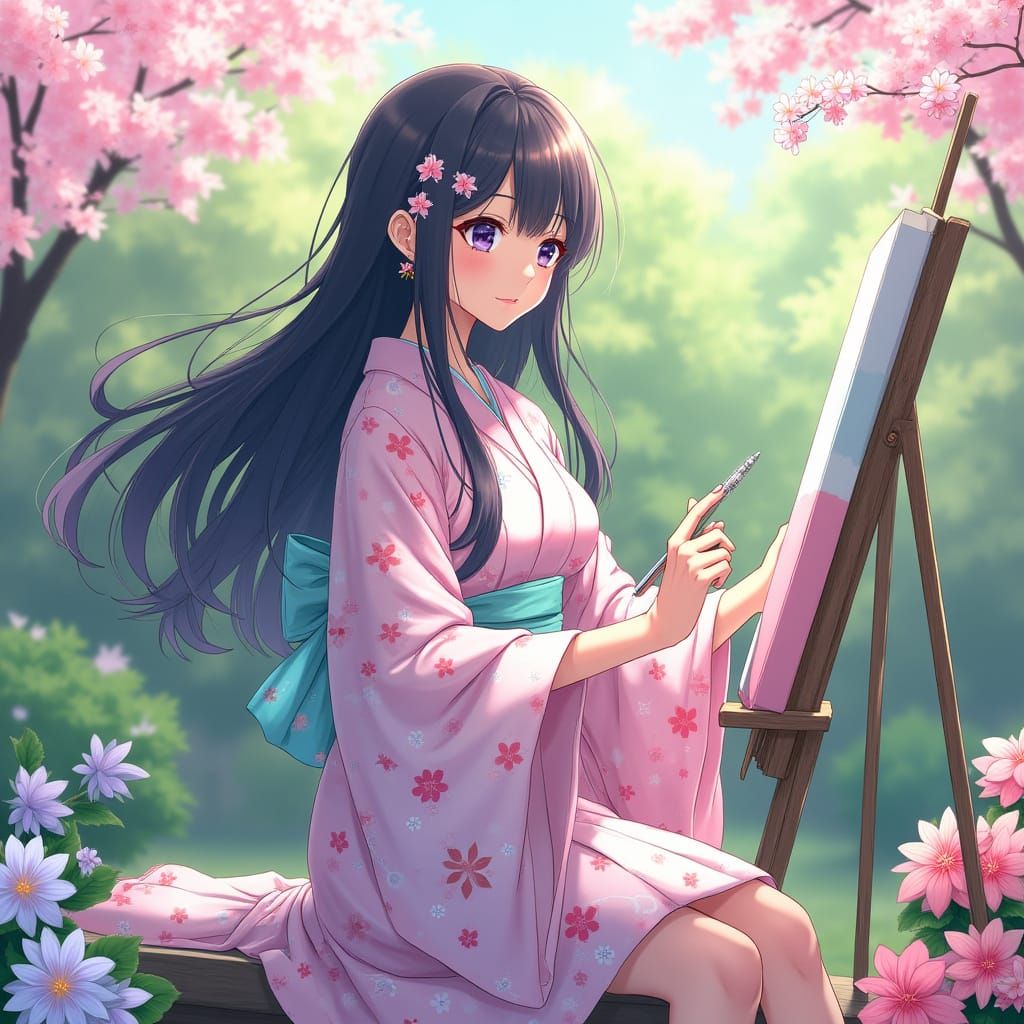 A young anime girl creates a vibrant painting in a serene garden setting, surrounded by soft sakura clips and a colorful yukata, blending elements of modern anime and Art Nouveau styles.